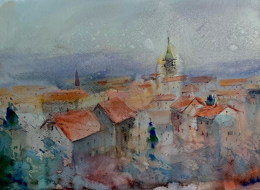 Nastala je sveža, igriva slikarija - igrarija. Ata je, bi rekel, postavil okna - okenca, zvonik, namalal strehe, otrok pa se je vmešal in namalal še nebo, dodal svoj vodni "pljonk", tak' malo tu in malo tam. Recimo.