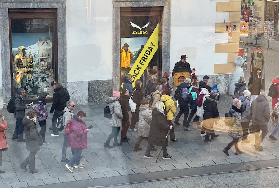Pred njo je nekdo na eni strani ceste na hladnem vrtel lajno in imel pred seboj škatlico za prispevke. Ljudje smo hodili mimo.